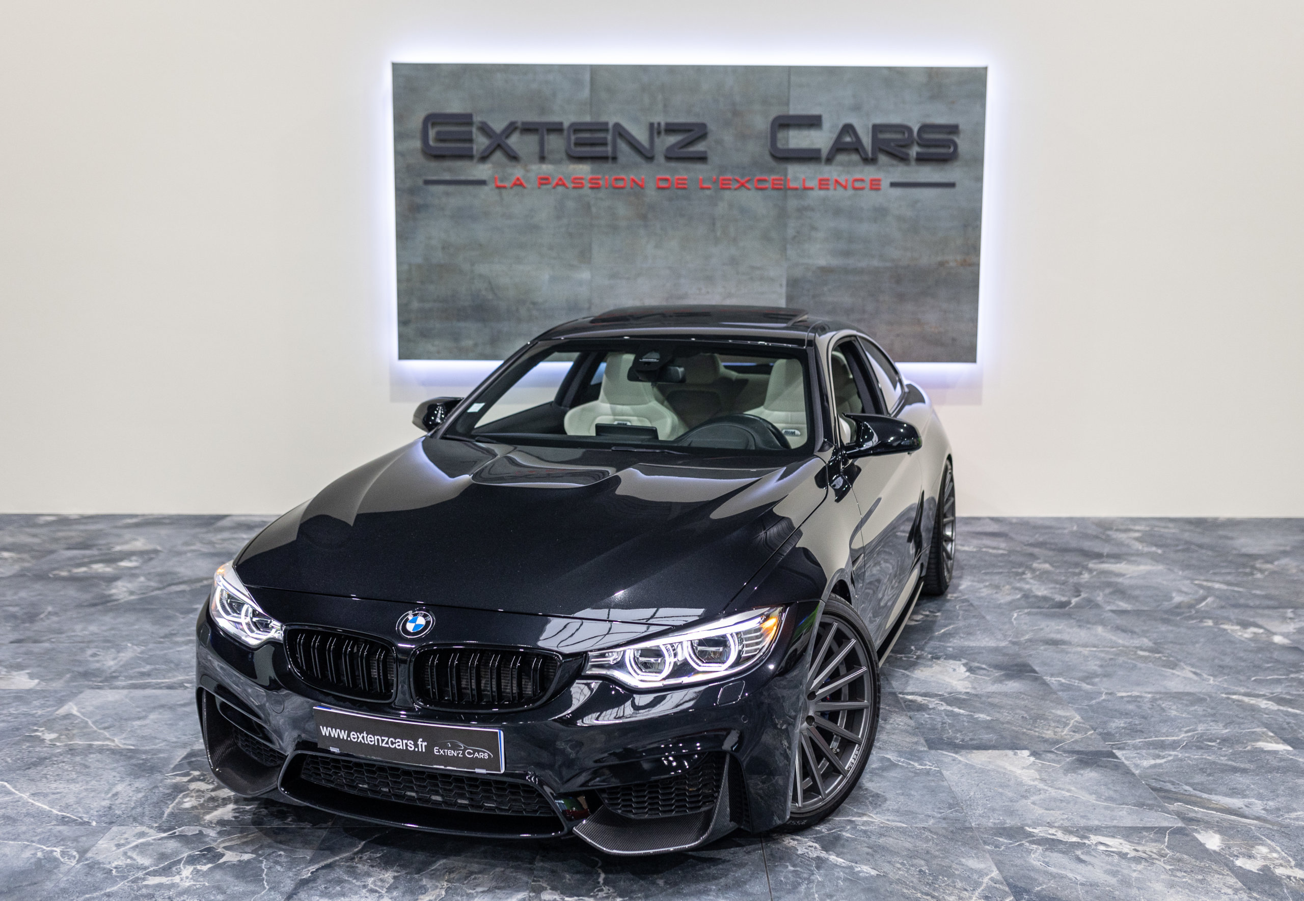 EXTEN’Z CARS vous propose cette magnifique BMW M4 Coupé Compétition Individual (F82) avec son fabuleux 3.0 six cylindres en ligne développant 450 CV (34cv), mise en circulation le 06/09/2016 de couleur Noir Saphir Métallisée. Vous remarquerez un bossage au niveau du capot des rétroviseurs spécifiques et 4 sorties d’échappement. Les superbes jantes 20 pouces VOSSEN cachent des étriers bleus siglés M. Mais quand on prend place, notre regard est surtout attiré par les magnifiques sièges sport en cuir avec emblème ///M rétro-éclairé. La boîte à double embrayage DKG à 7 rapports est d’une efficacité redoutable. En s’amusant avec les différents réglages agissant sur la boîte, la réponse moteur, la direction et les suspensions, on trouve celui qui nous convient, sachant que l’amortissement s’adapte automatiquement à votre rythme de conduite, si vous ne touchez à rien.
