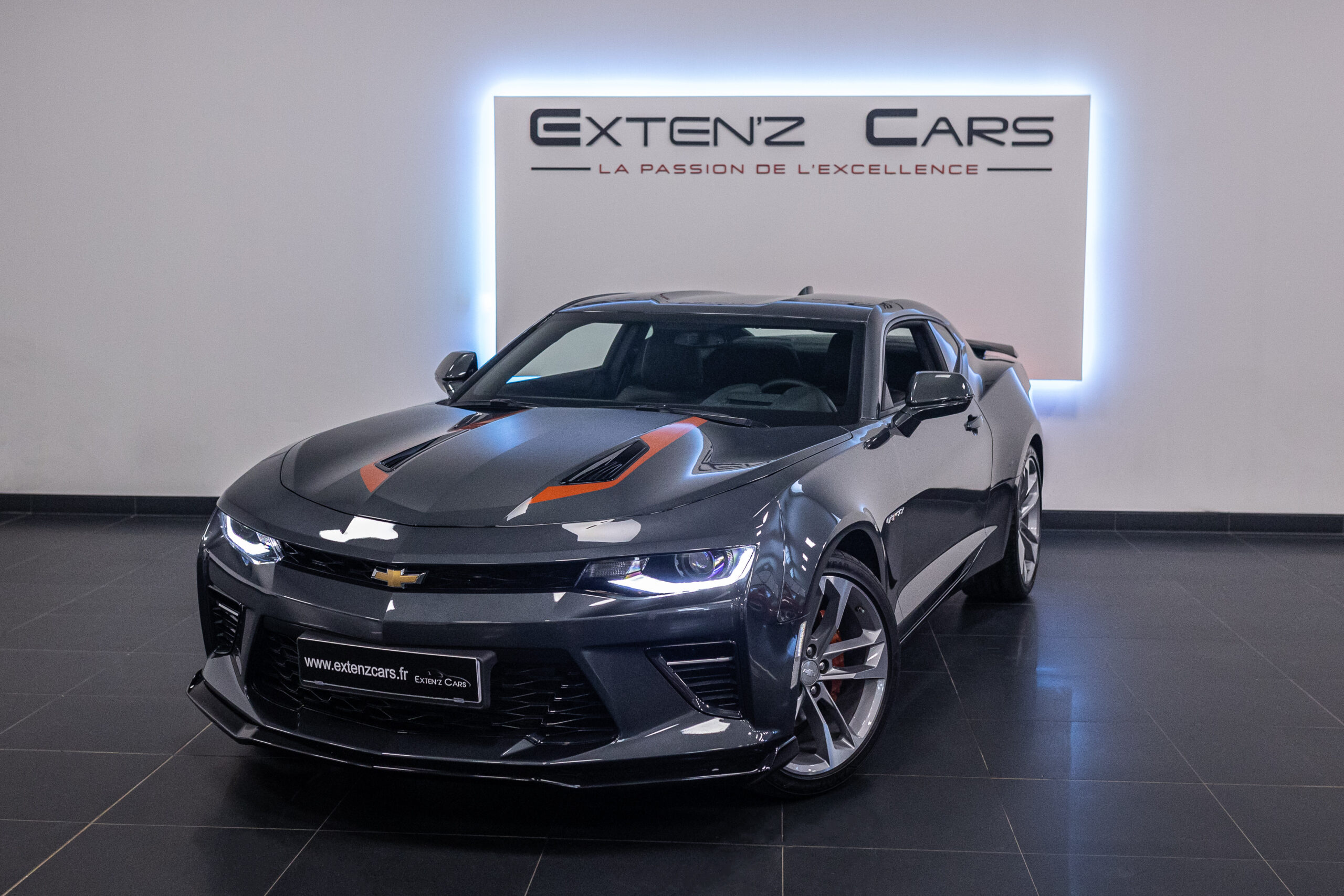 EXTEN’Z CARS vous propose cette séduisante Chevrolet Camaro VI Coupé Edition Fifty avec son fantastique V8 6.2 Atmosphérique développant 453 CV (35cv), mise en circulation le 16/06/2017. Associée à une boite à vitesse automatique à 8 rapports, si vous préférez une conduite plus sportive, il lui suffit de passer en mode manuel à l’aide des palettes de changement de vitesse au volant pour disposer alors des 8 rapports fixes. Cette Camaro distille beaucoup de plaisir à ses occupants tout en offrant un rapport prix/plaisir. En particulier sa silhouette bodybuildée, la position de conduite est parfaite et on peut admirer devant soi le long capot bosselé. Prendre les commandes d’un tel engin, aussi imposant par le gabarit que par son histoire, génère des sensations extraordinaires. L’édition 50ème Anniversaire dispose d’une peinture NightFall Grey Metallic avec des bandes orange sur le Capot, La Calandre et sa grille ont été retravaillés pour ce modèle exclusif tout comme les jantes 20 Pouces et les Étriers de Frein Orange.