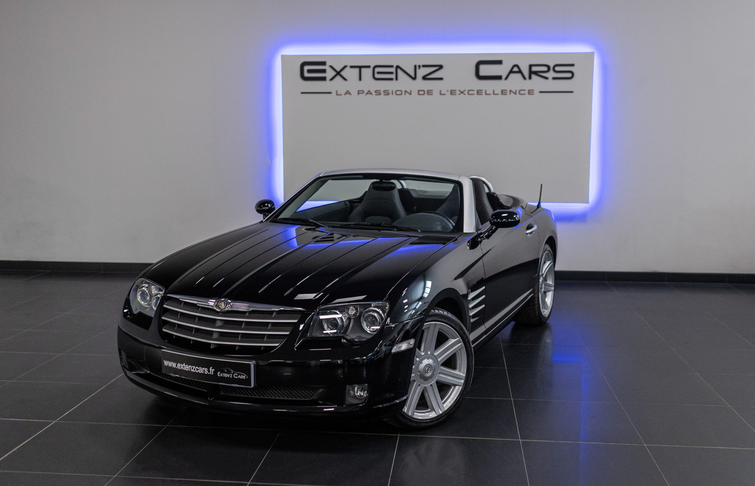 EXTEN’Z CARS vous propose cette magnifique Chrysler Crossfire Cabriolet avec son 3.2 V6 développant 218CV (15cv) mise en circulation le 19/10/2007 de couleur Noir métallisé. Le Crossfire Cabriolet ne perd rien de son charme, un roadster original qu’il n’est pas donné de croiser à chaque coin de rue. Un capot long strié, une ligne de toit descendante, des écopes de ventilation en aluminium, un galbe prononcé. Rien à redire, ce roadster « a de la gueule ». D’inspiration Mercedes, le châssis est très équilibré par le jeu d’un long empattement, de voies larges et de trains roulants modernes associés à des pneus de généreuses dimensions. Sa capote munie d’une lunette arrière en verre est du plus bel effet, son design ciselé ne laisse personne indifférent.